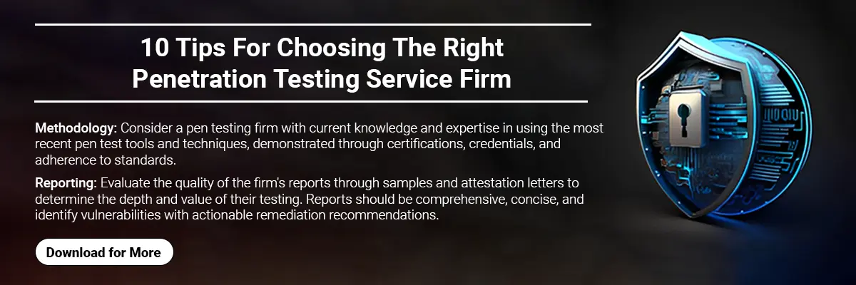 When choosing a penetration testing firm, it is critical to consider the testing team’s certifications, such as CEH (Certified Ethical hacker), OSCP (Offensive Security Certified Professional), and other relevant qualifications. However, evaluating the company’s credentials to ensure competence is equally important.