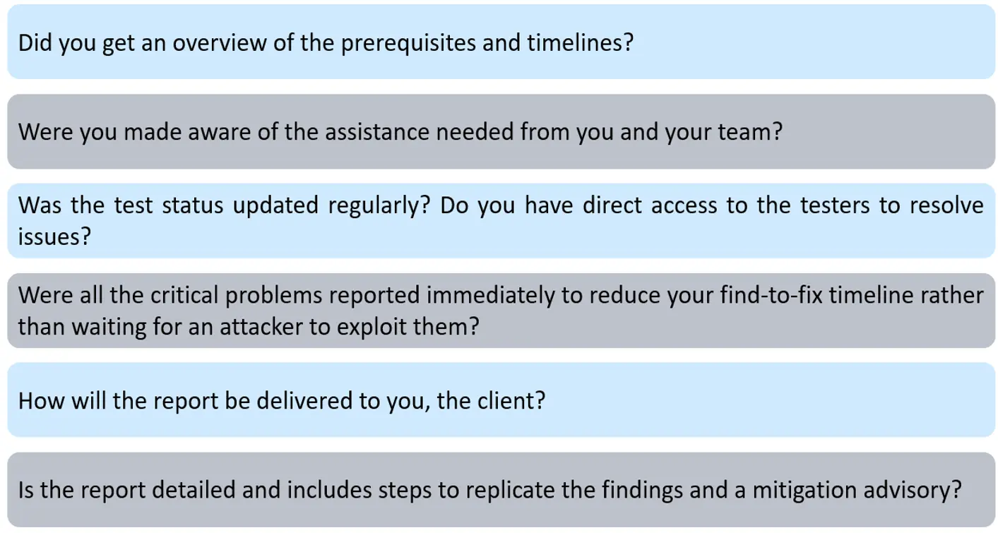 Is your security company available when you need them? Do they have a large enough team to respond quickly if you need something tested? Do they have experience in various environments? On a multi-test contract (either testing multiple times a year or for multiple years), they can also frequently change the person performing the test. Although this is slightly less efficient than having the same person do it for years, it allows a different perspective on the application or network, as well as attack scenarios. As much as we try to make testing a science, there is also an element of art to it.
