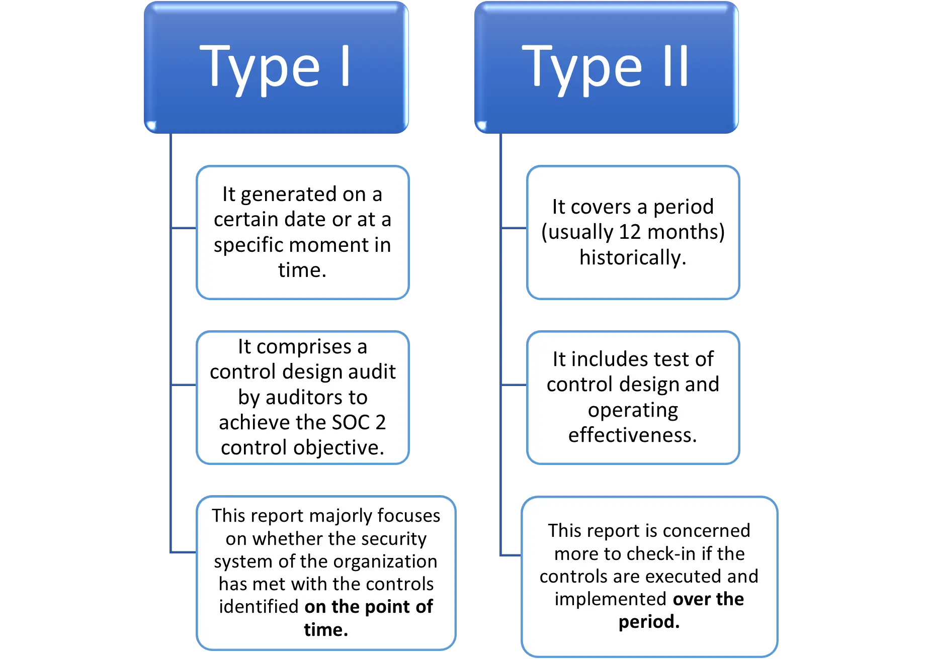 - A Type 1 report is typically sought after by companies that have a nascent security framework and maturity. For this report, auditors focus on the security framework (Policies, Procedures, and SOPs) and implementation of internal controls. They review the evidence and provide their feedback to capture the current posture against all the clauses. This capture also includes exceptions, deviations, etc.The Type 1 report is a point-in-time assessment and does not assess control maturity. Hence, it’s ideal for companies that have recently implemented their security framework and controls.